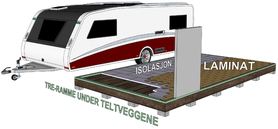 ! Ved valg av denne løsningen leverer ikke ScandiCamp isolert gulv da risikoen for setningsskader i plattingen er for stor. Kunden står selv ansvarlig for eventuell senere justering av dører og gummitetning grunnet risiko for setninger i plattingen. 5 års garanti gjelder fortsatt for selve konstruksjonen av helårsteltet.![]()