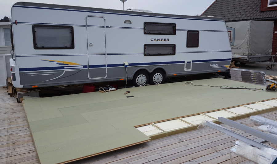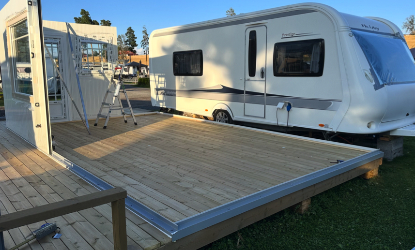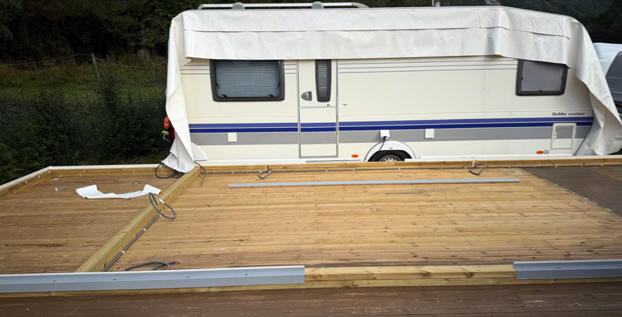 Som den beste og mest langsiktige løsningen anbefaler ScandiCamp å demontere eksisterende platting og bygge en helt ny platting, tilpasset helårstelt og vogn.