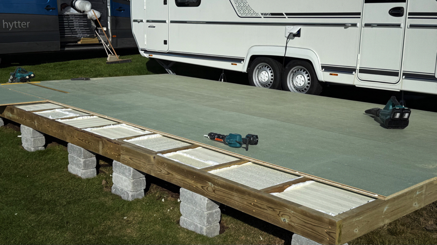 - Ønsker isolert gulv (med eller uten varmefolie), men eksisterende platting er større enn valgte mål for ScandiCamp helårstelt. I slike tilfeller monterer ScandiCamp en ny platting over den eksisterende, med fastmontert isolasjon i ramme under vannfaste sponplater.